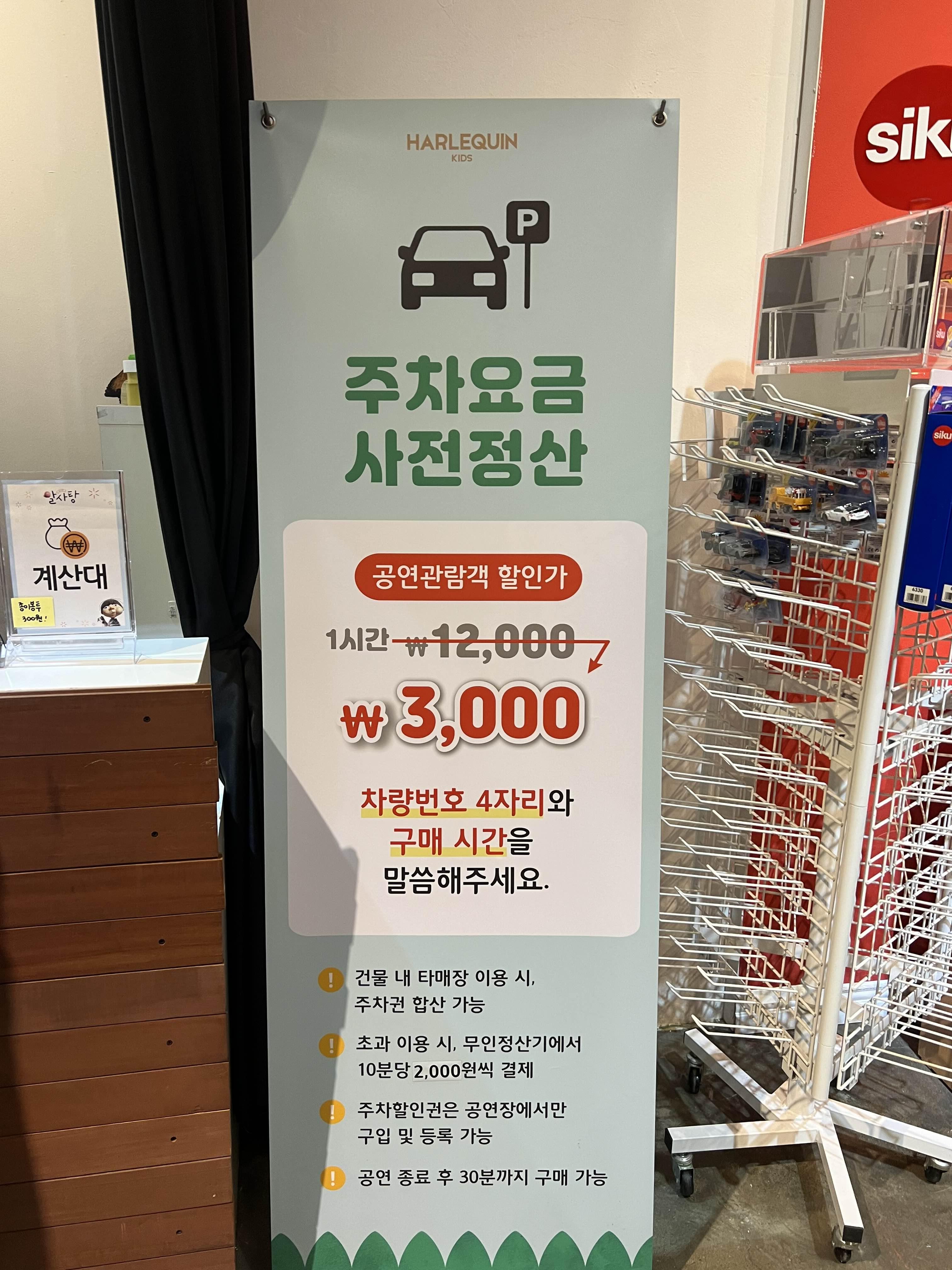 공연관람객에게는 할인가를 적용하여 1시간에 3천 원 주차권 구매하시면 되고 총 3시간까지 가능합니다.