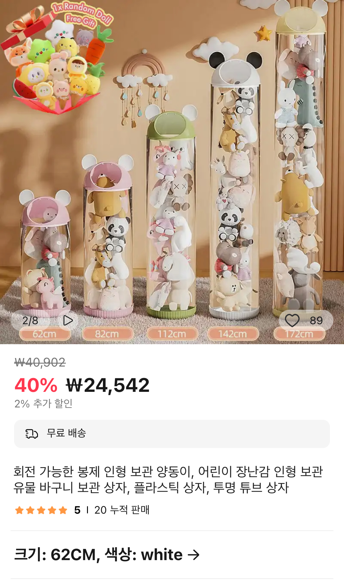 크기는 62cm / 82cm / 112cm / 142cm / 172cm 다섯 가지 옵션으로 되어 있고