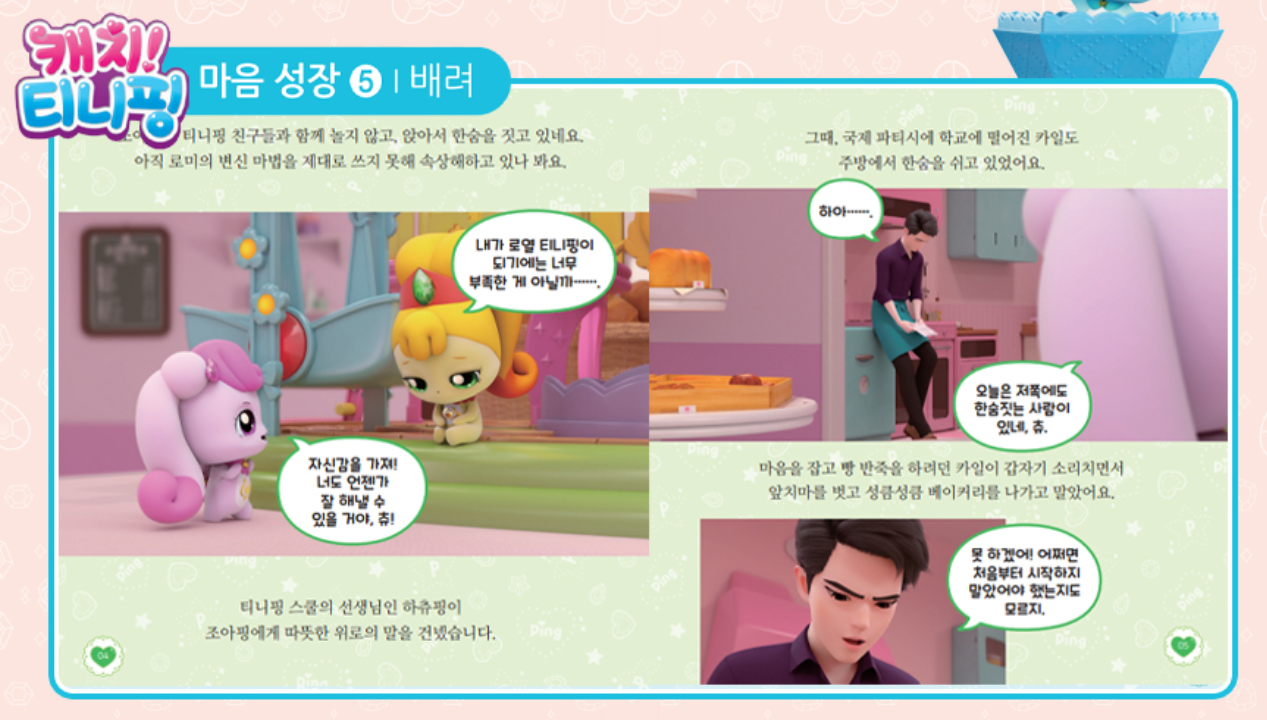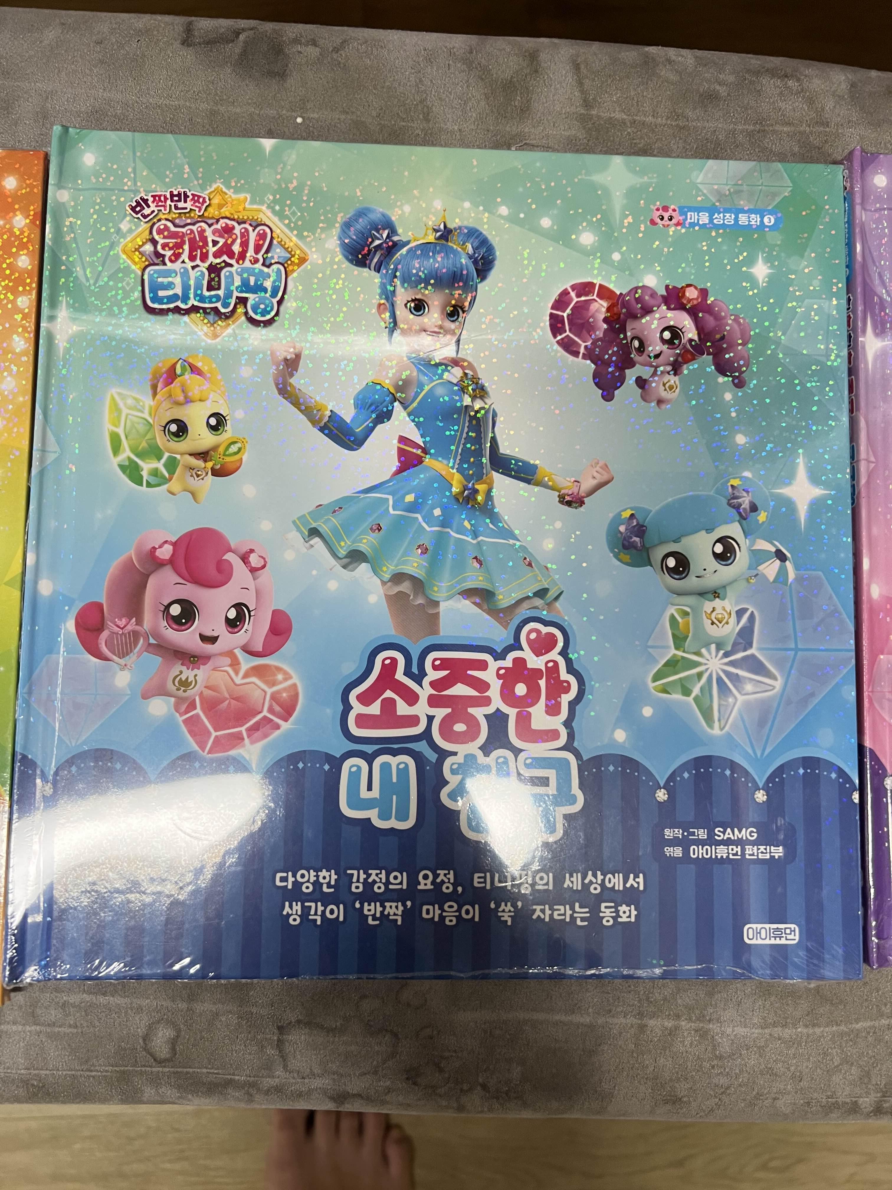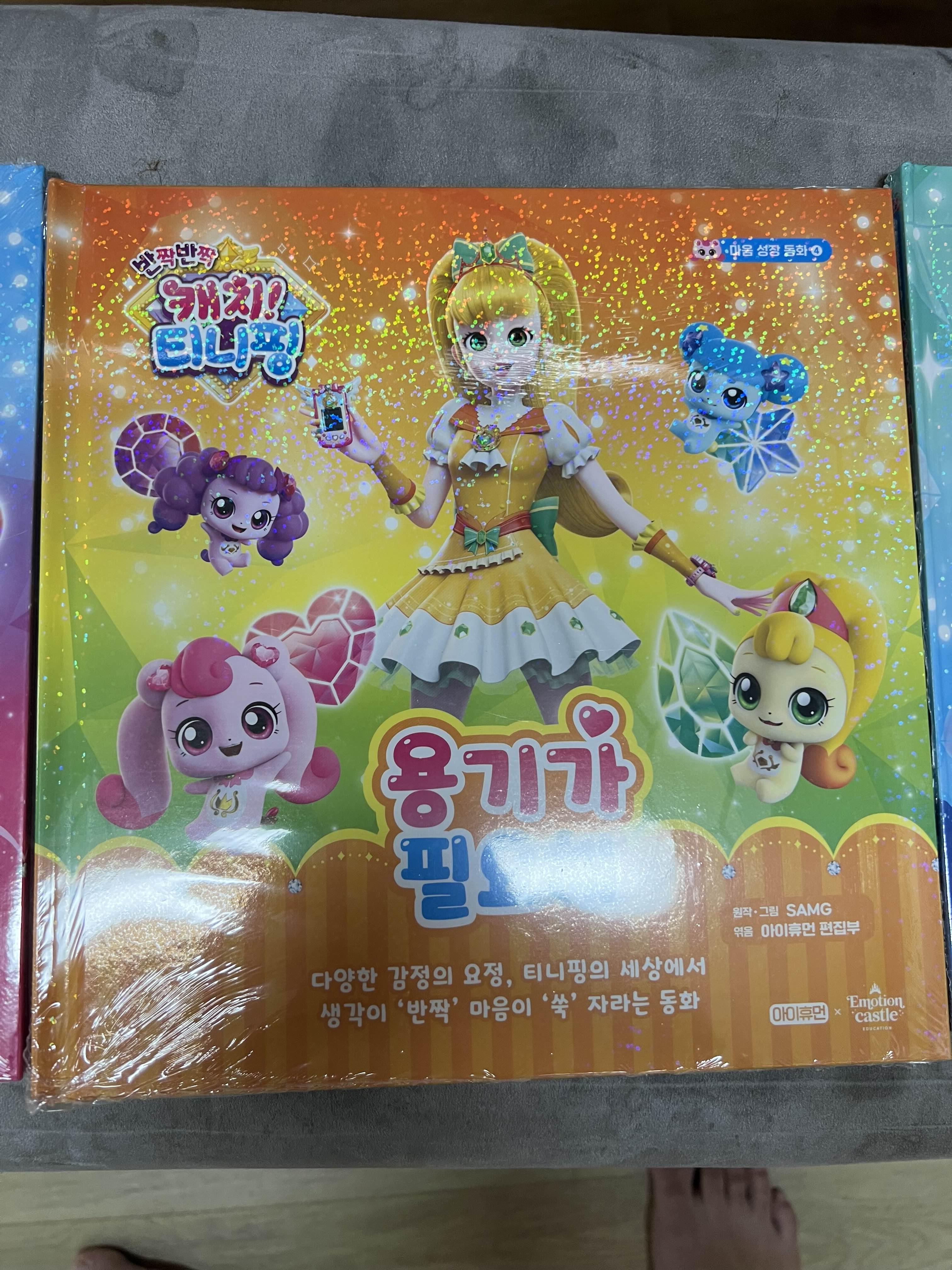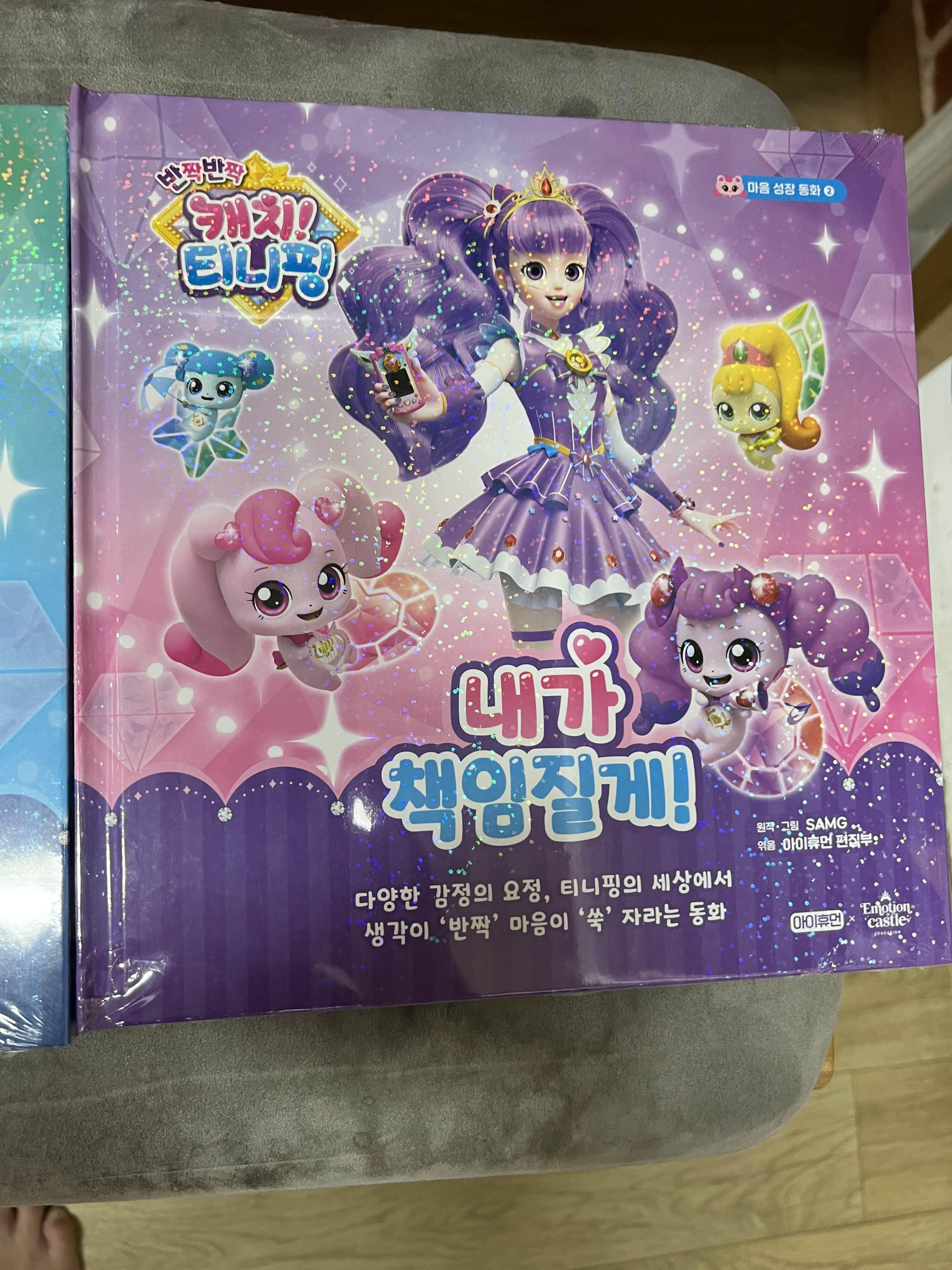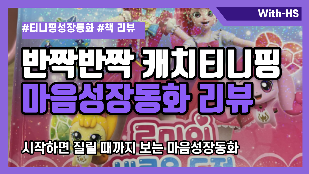 요즘 현서의 관심사는 온통 캐치! 티니핑입니다. 저는 티니핑 시즌이 벌써 4까지 나왔는지 몰랐는데요. ㅋㅋ 시즌이 4까지 진행된 만큼 그 인기도 대단하고 굿즈들도 엄청 많더라고요. 혹자는 간혹 티니핑을 "파산핑"으로도 부르기도 한다는데 왠지 그 이유를 알 거 같습니다. 티니핑은 종류도 엄청 많은데요. 처음에 티니핑을 접한 현서가 티니핑 종류들이 쭉 있는 스티커 책을 보며 "얘 이름은 뭐야? 얘 이름은 뭐야?"라고 물어보는데 너무 많아서 대답을 못해주겠더라고요. 그때 당시만 해도 가장 유명한 하츄핑과 로열 티니핑 정도만 이름을 알고 있었거든요. 그래서 다른 티니핑들의 이름을 알려주기 위해 따로 공부하기도 하였답니다 ^^; 아직도 다 몰라요. ㅋㅋㅋ 너무 많더라고요. 다행인지 현서는 그중에서도 하츄핑을 가장 좋아하지요. 그리고 티니핑을 너무 좋아한 덕분에 마트나 이런 곳에 가면 티니핑이 보이기만 하면 쪼르르 달려가 사달라고 하는 통에 온통 진땀이 나더라고요. ㅜㅜ 너무 귀여워서 사주고 하다 보니 저희 집에도 온통 티니핑 관련 굿즈들이 하나둘씩 자리 잡고 있습니다. 다음에 티니핑 굿즈들도 한 번 소개하는 포스팅을 써볼까 하는데 이번에 써 볼 굿즈는 최근에 세돌이 지난 현서가 삼촌으로부터 선물로 받은 캐치! 티니핑 마음성장 동화입니다.